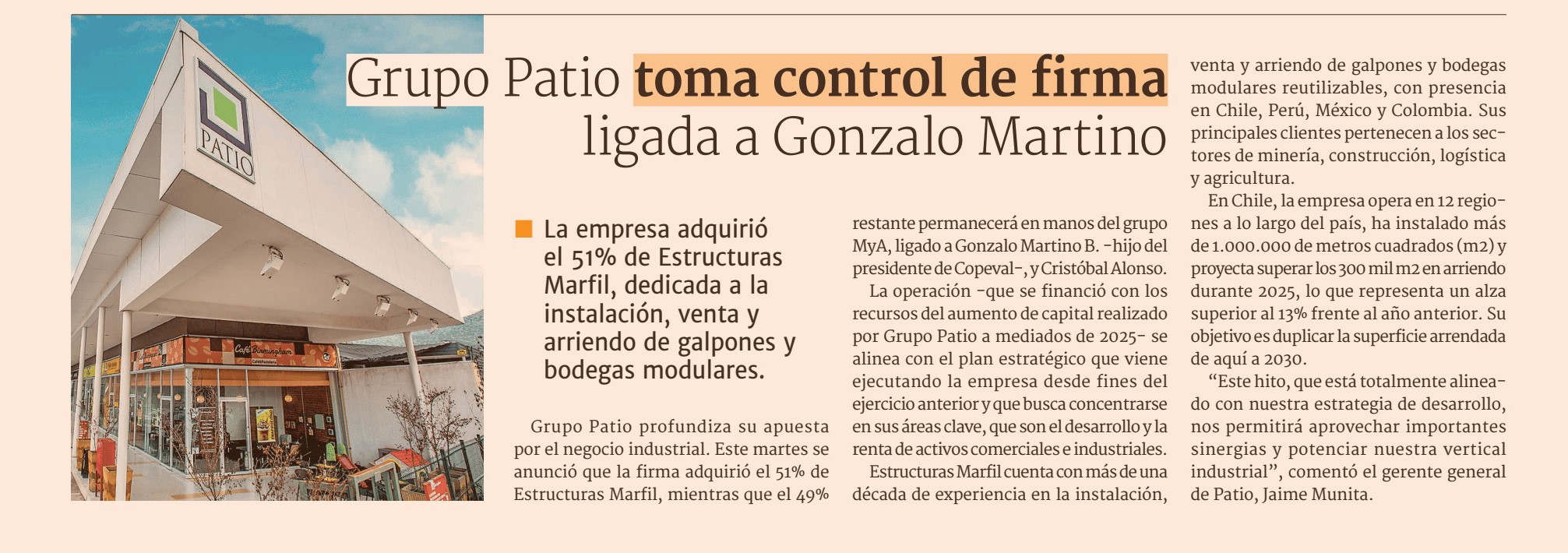 .SHAREGrupo MyA, related to Gonzalo Martino B. and Cristobal Alonso, sold 51% of Estructuras Marfil, a company dedicated to the installation, sale, and rental of modular warehouses and storage facilities, and a recognised player in the industrial equipment sector, to Grupo Patio.